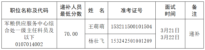 《国家粮食和物资储备局2026年度公开遴选公务员面试公告》发布后,因部分考生自愿放弃面试资格,根据公务员遴选工作有关规定,按照笔试成绩从高到低的顺序,递补以下考生为面试人选(同一职位考生按照准考证号排序):